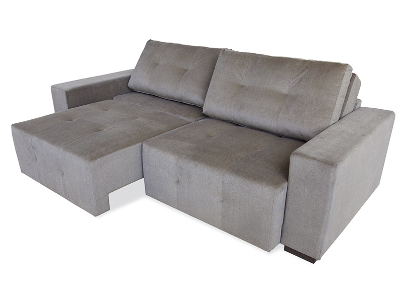 Sofá bipartido com almofadas soltas, opção retrátil com extensor em metal. Pode ser utilizado com cama.