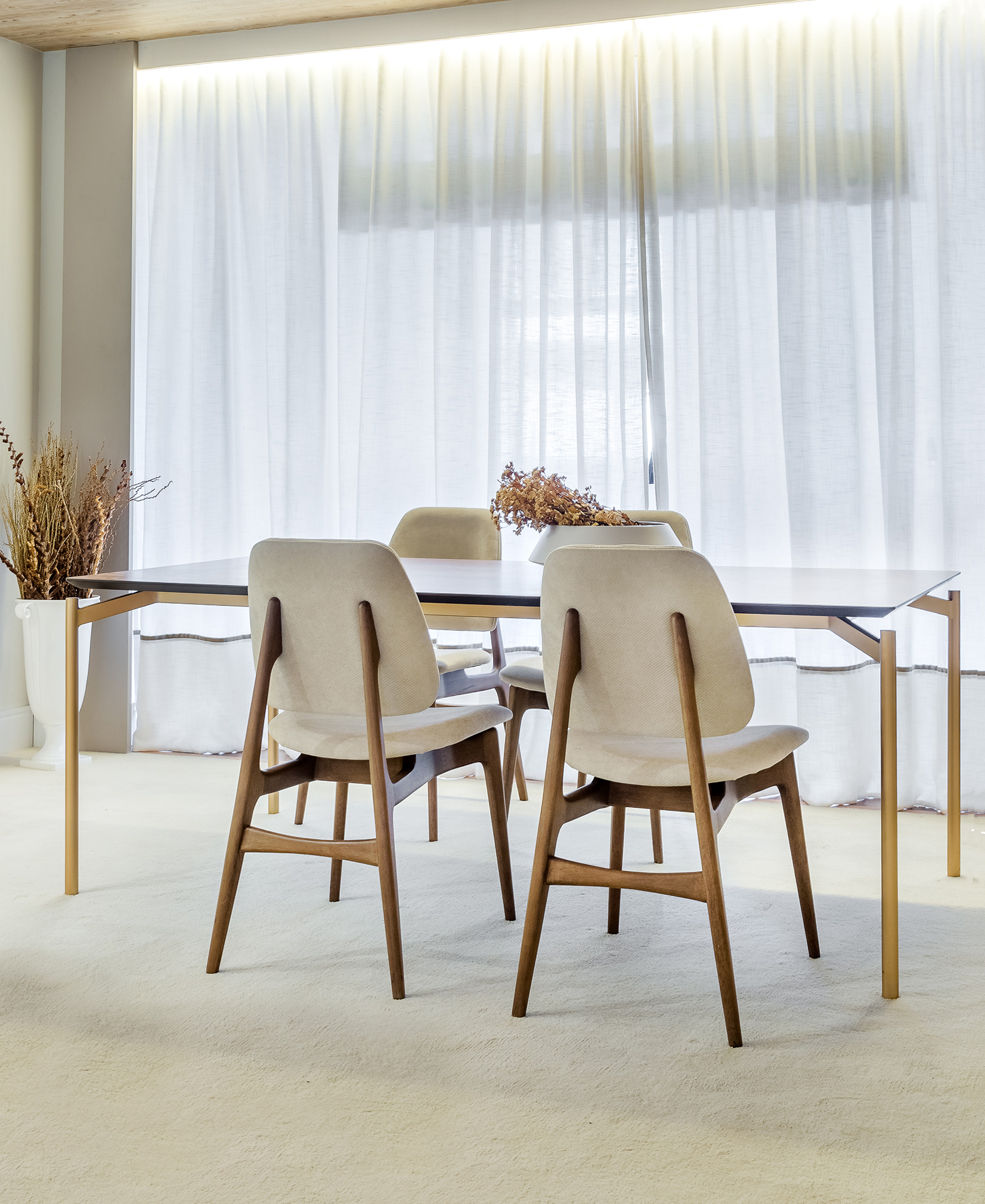 A Mesa de Jantar Poly é uma mesa moderna, com um visual mais minimalista e muito sofisticada. O tampo é slim com os cantos arredondados e o pé é em aço carbono, com detalhe na parte superior. Ela tem sete variações, podendo ter o tampo em madeira, vidro cristal tonalizado, ripado ou petra e também tem a opção dos formatos retangular ou quadrada.